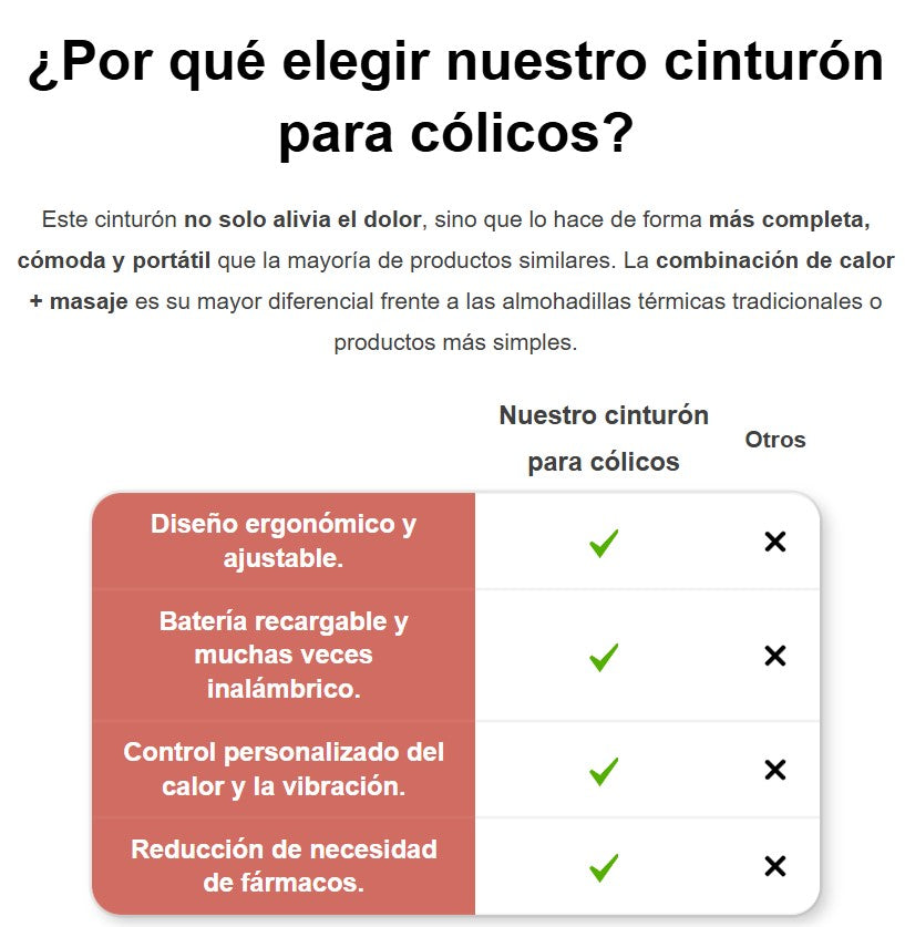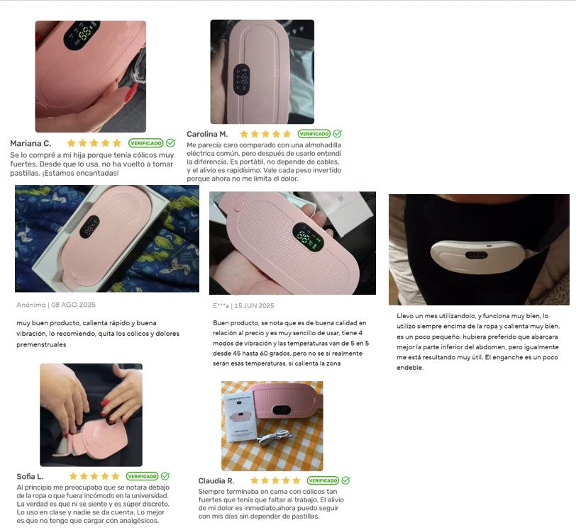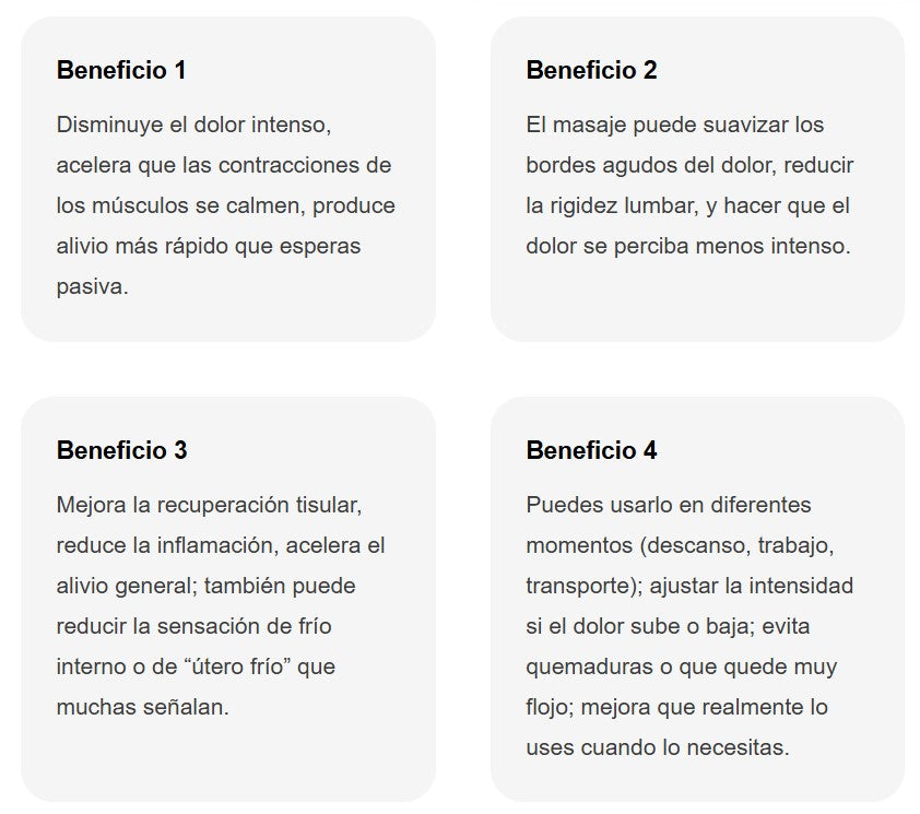 El cinturón combina terapia de calor con masaje por vibración, lo que ayuda a relajar los músculos del útero, mejorar la circulación y aliviar el dolor menstrual de forma natural y segura.