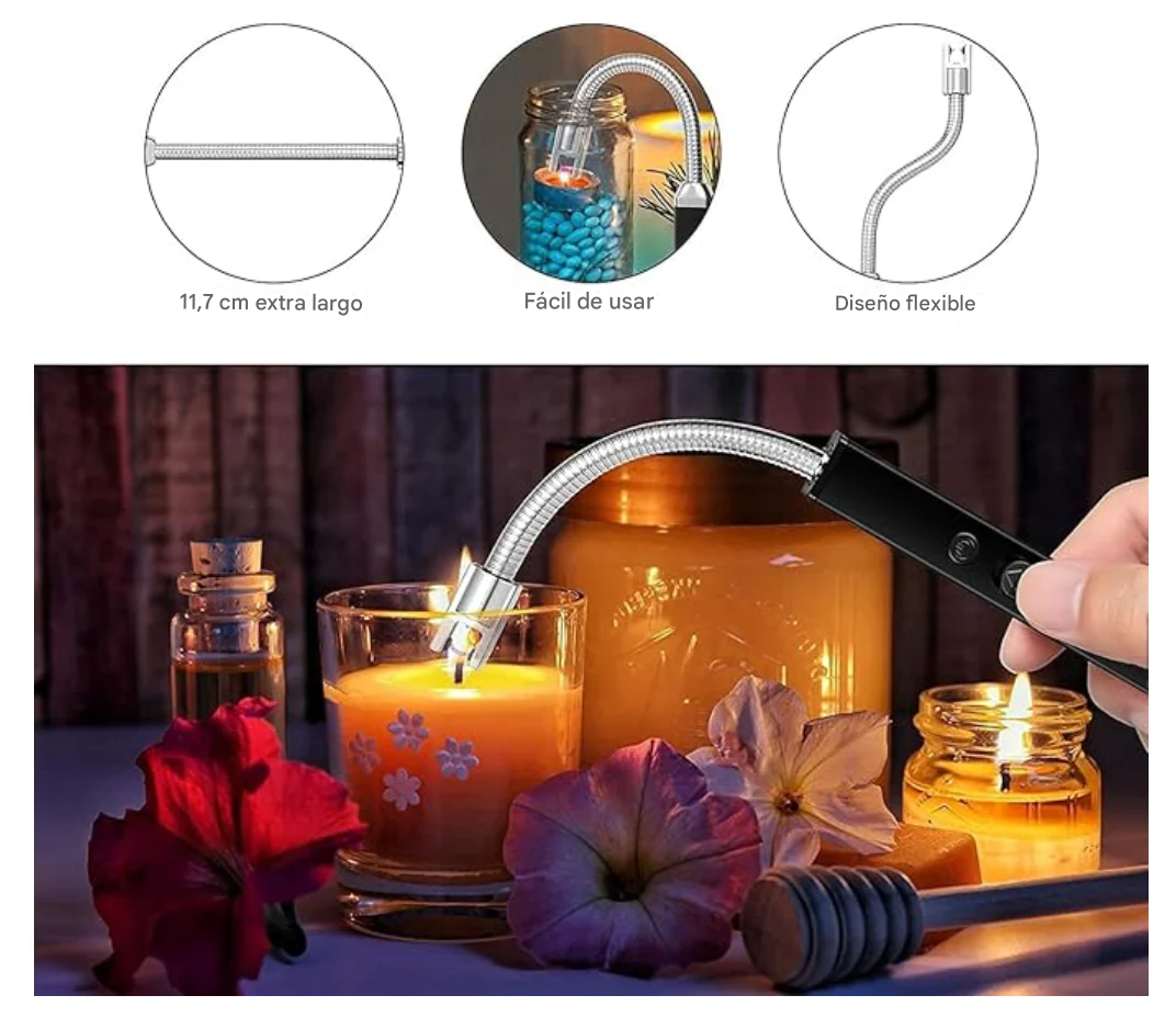 - 🌀 Cuello flexible de 360° – Llega fácilmente a lugares difíciles, como velas en frascos o parrillas profundas.