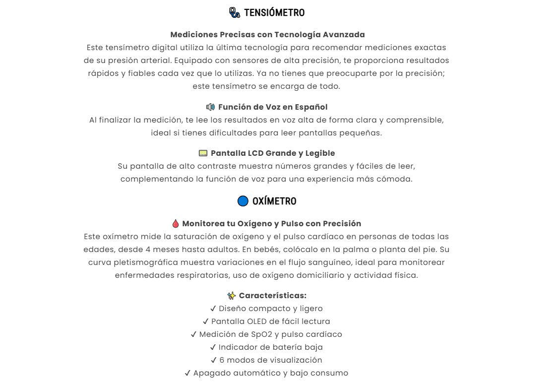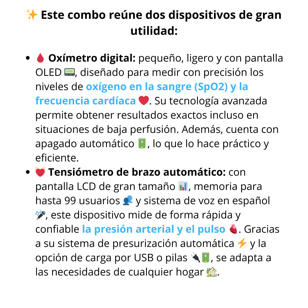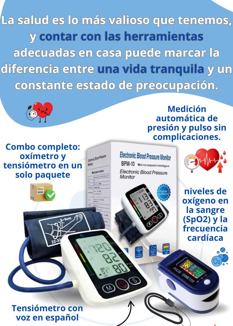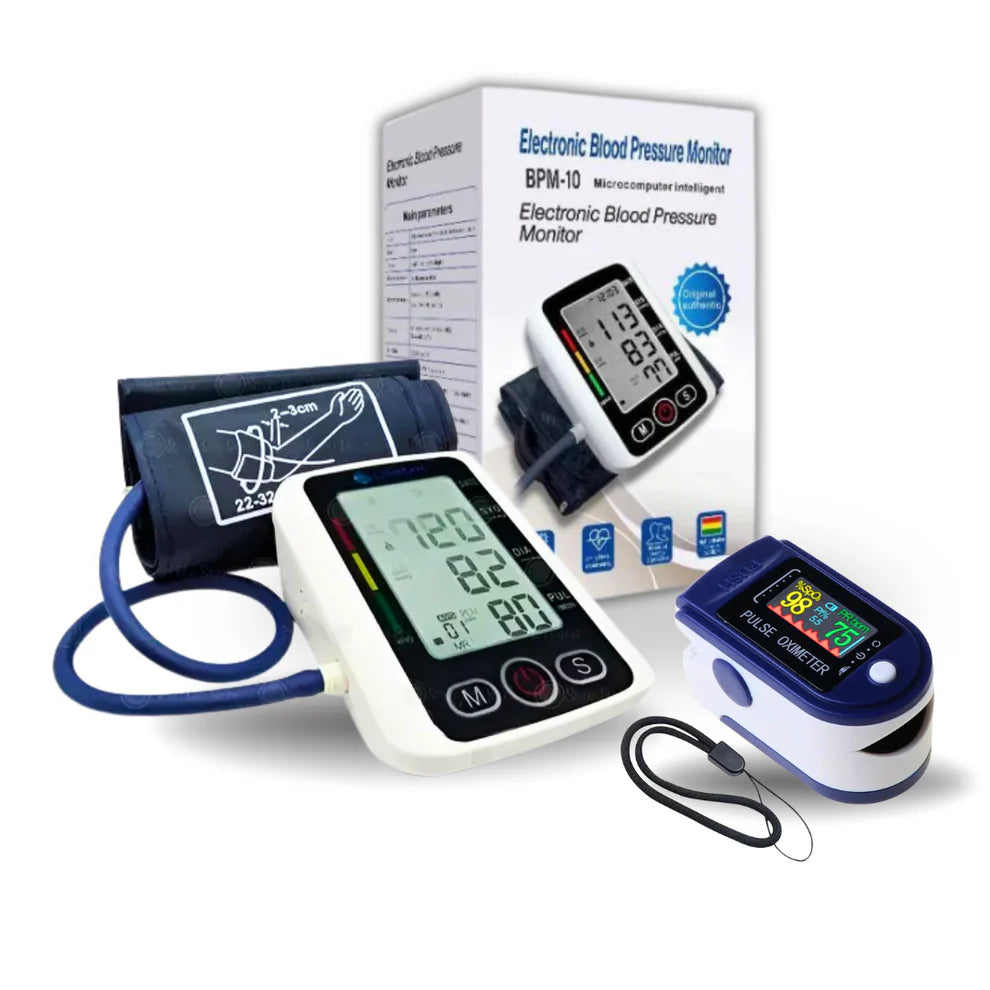 Con nuestro kit de tensiómetro digital, pulsioxímetro y termómetro digital, tendrás todo lo que necesitas para monitorear tu salud desde la comodidad de tu hogar.